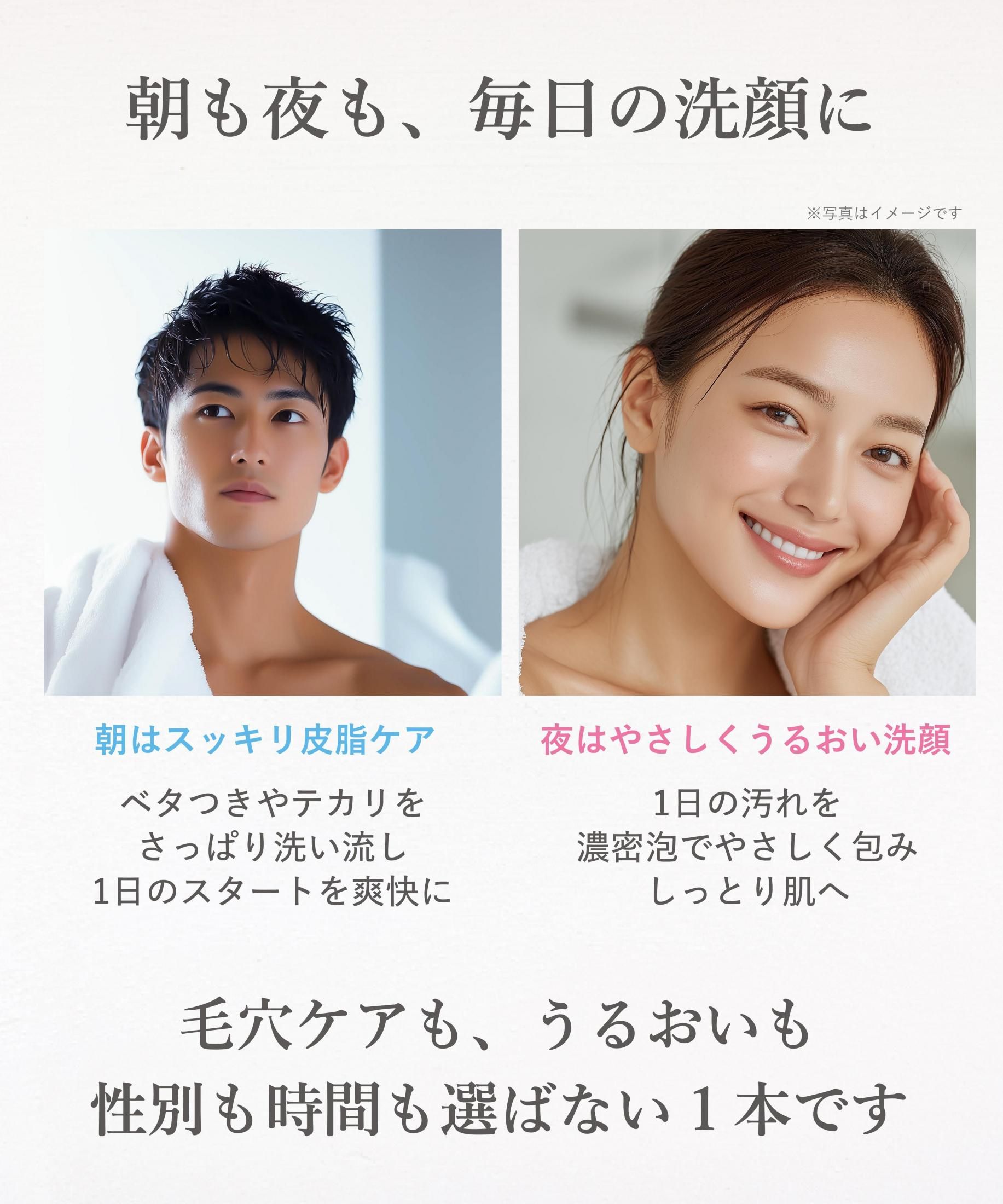 朝は皮脂をすっきりリセットしてメイク前の肌を整え、夜はやさしい香りに包まれて一日の疲れをリフレッシュ。