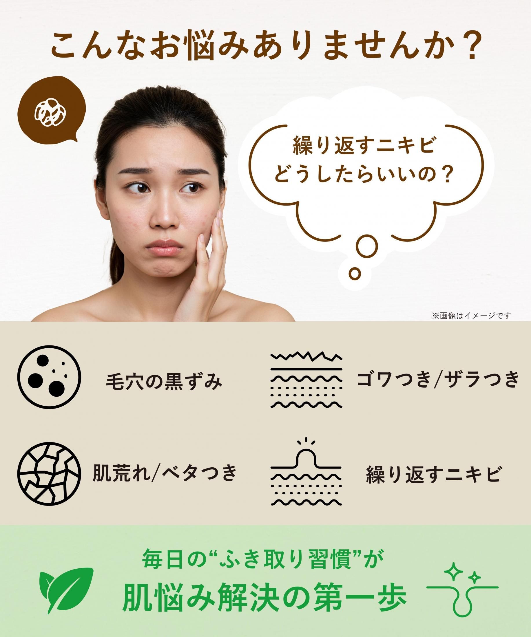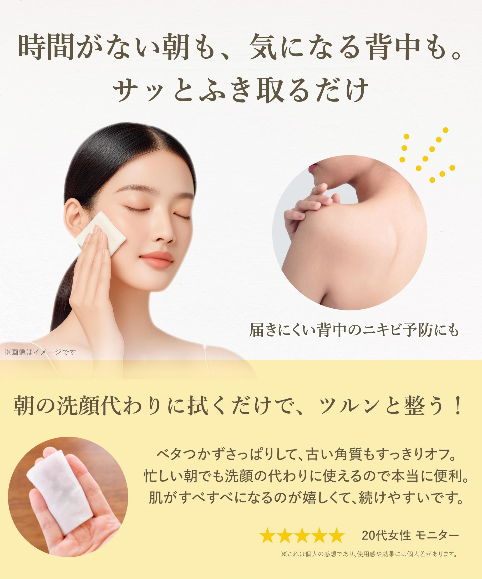 ・顔の中心から外側に向かってやさしく拭き取ります。特にザラつきや毛穴が気になる部分には、何度かやさしく拭き取ってください。
