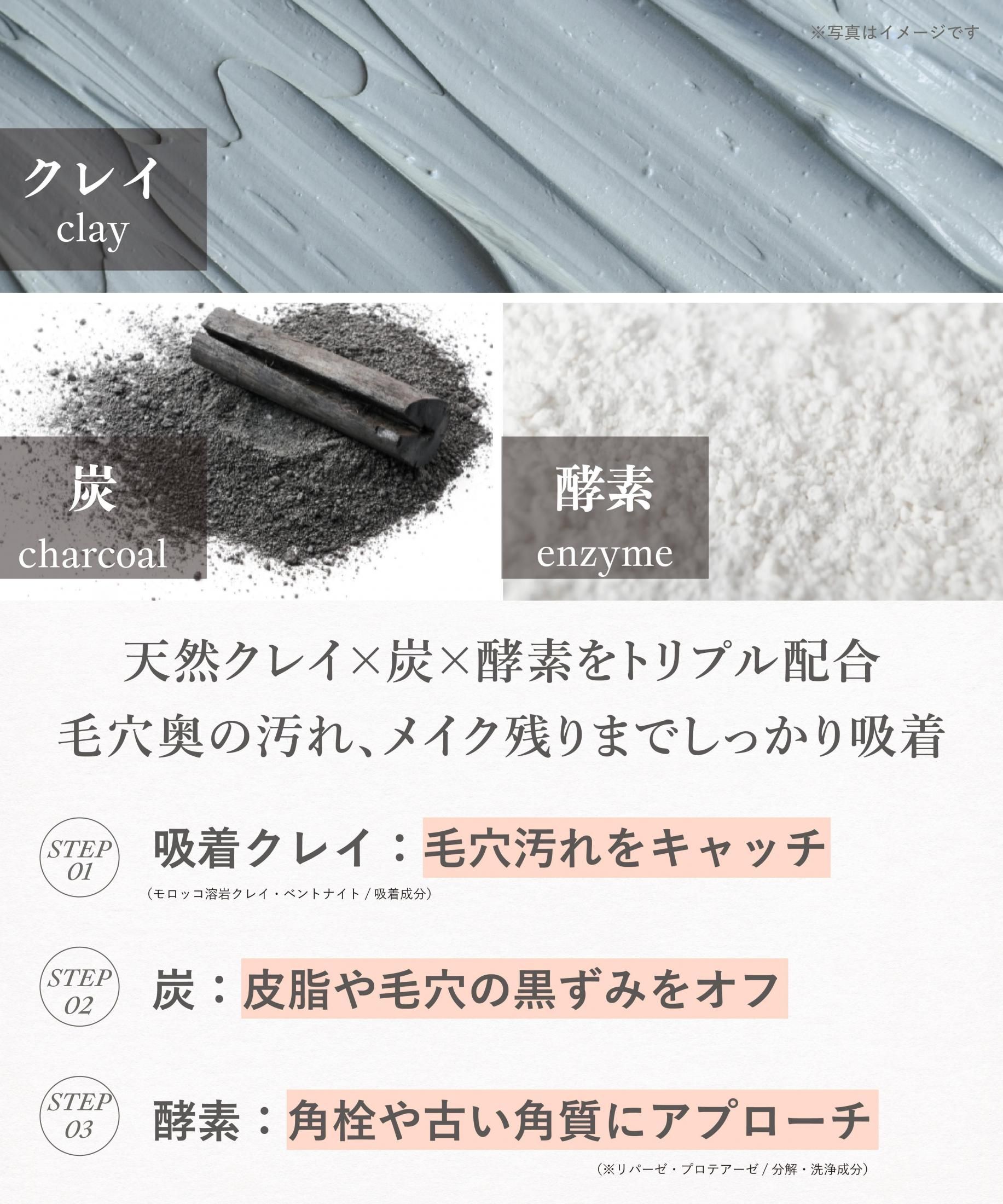炭×酵素×クレイの3種のディープ洗浄成分が、毛穴の奥の汚れや皮脂をすっきりオフ。