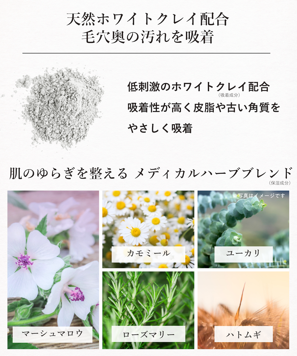 天然ホワイトクレイ × 鎮静ハーブで、肌を労わりながら、毛穴・肌荒れケア。