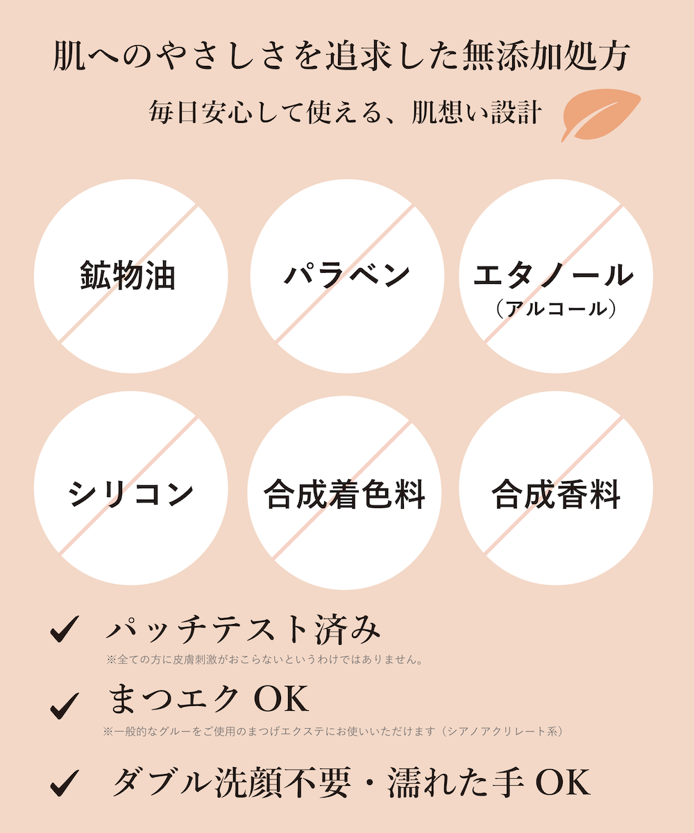 ・6つの無添加(鉱物油・パラベン・エタノール・シリコン・合成着色料・合成香料 すべてフリー)