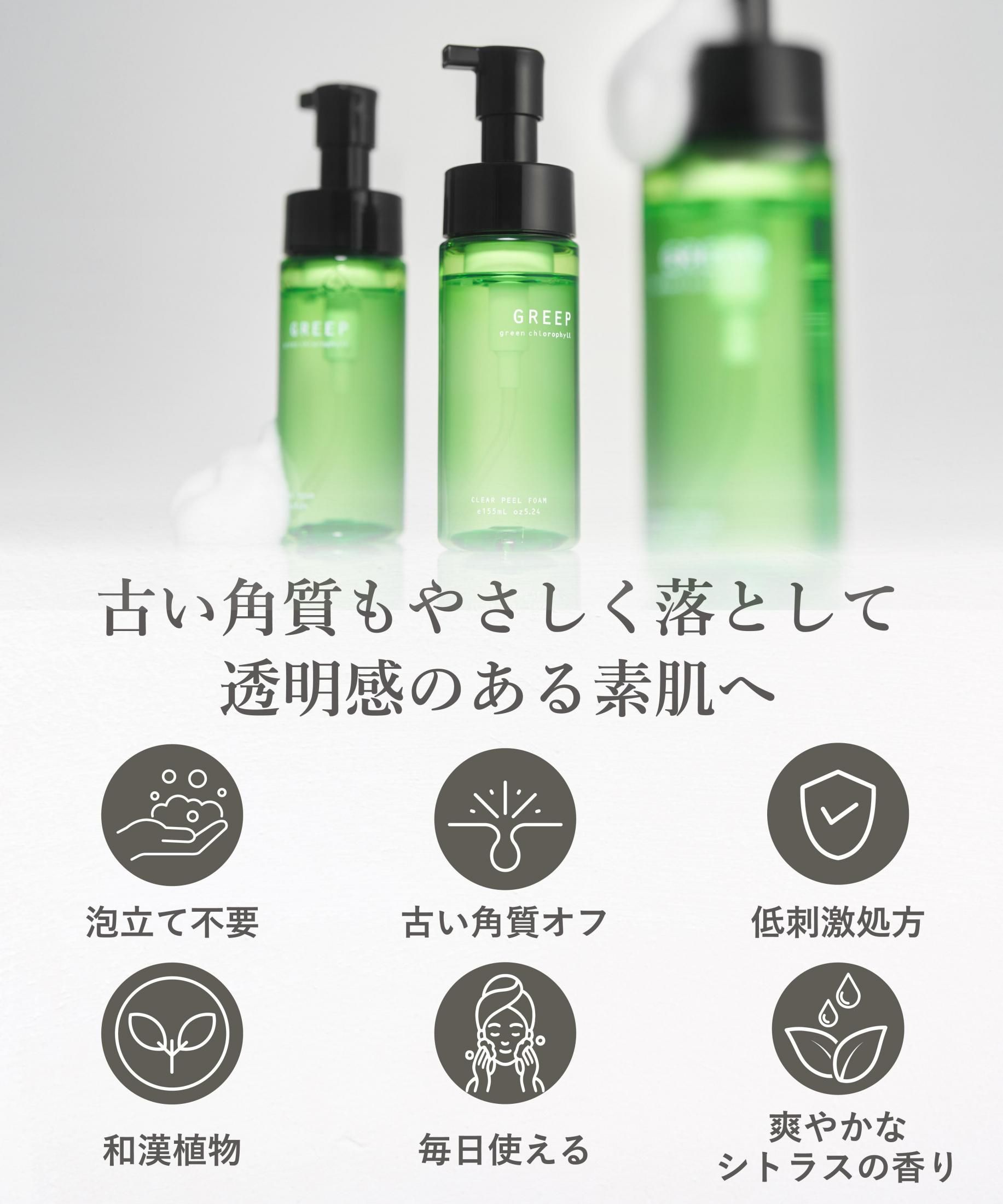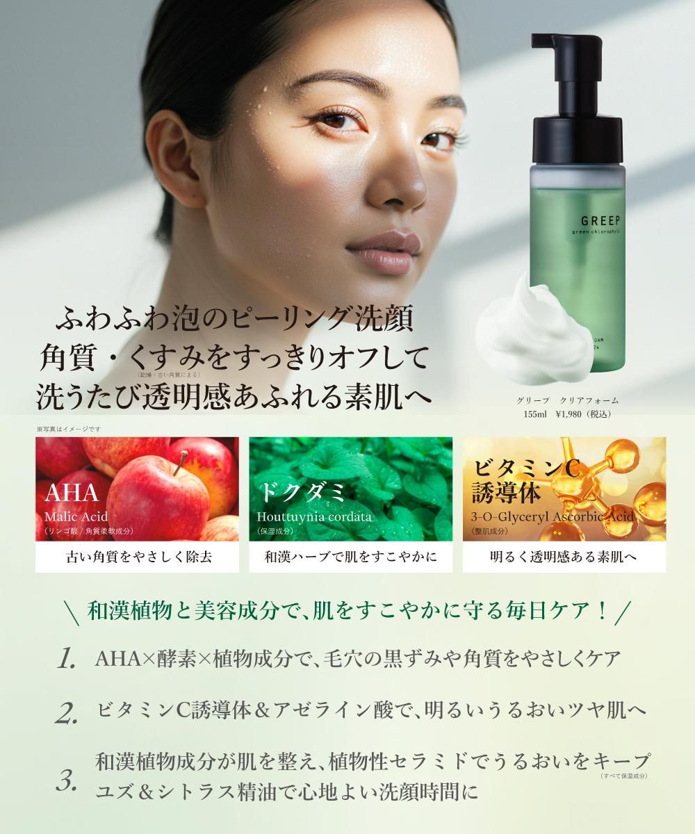 さらに、GREEPを象徴するドクダミ・ヨモギなどの和漢植物エキスが肌をすこやかに整え、