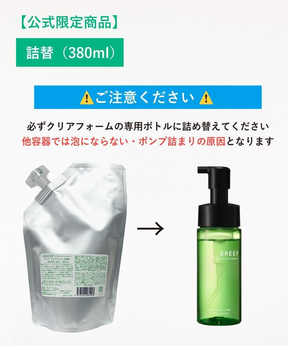 ●必ず「グリープ クリアフォーム」の使用済みボトルに詰め替えてください。他の容器に詰め替えると泡にならない、ポンプが詰まるなどの原因となります。